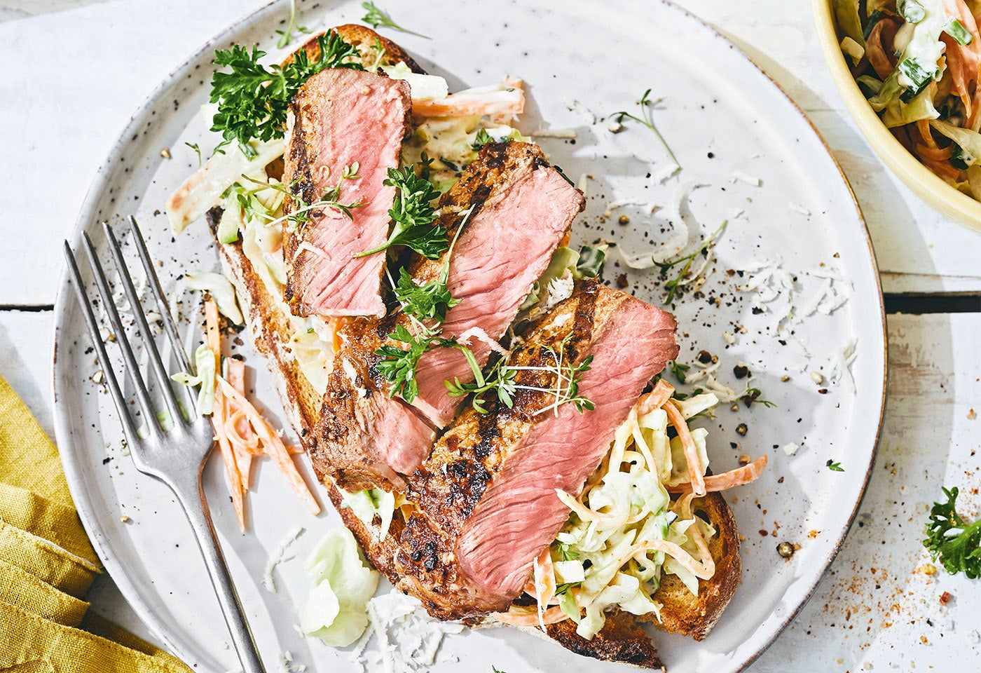 Rib-Eye-Steak mit Coleslaw auf Röstbrot