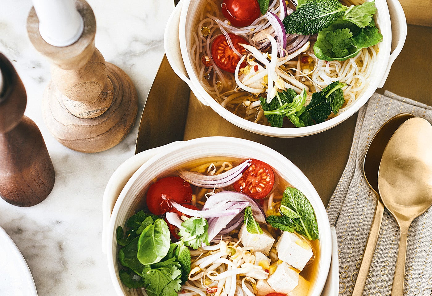 Asiatische Frühstückssuppe mit Tofu und Glasnudeln