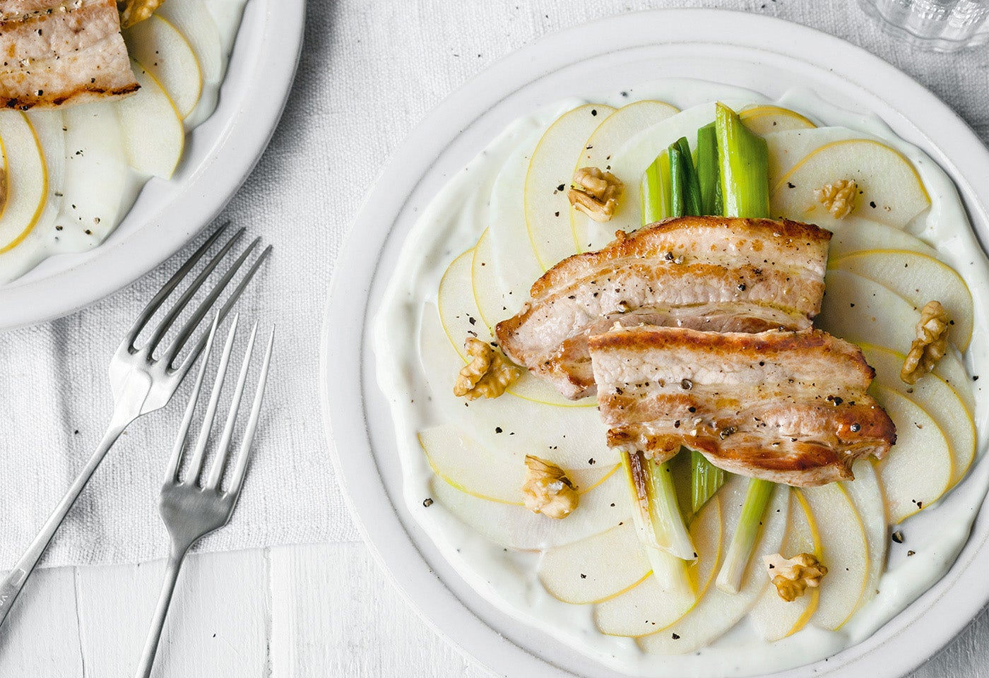 Gebratenes Bauchfleisch auf Kohlrabi-Waldorfsalat