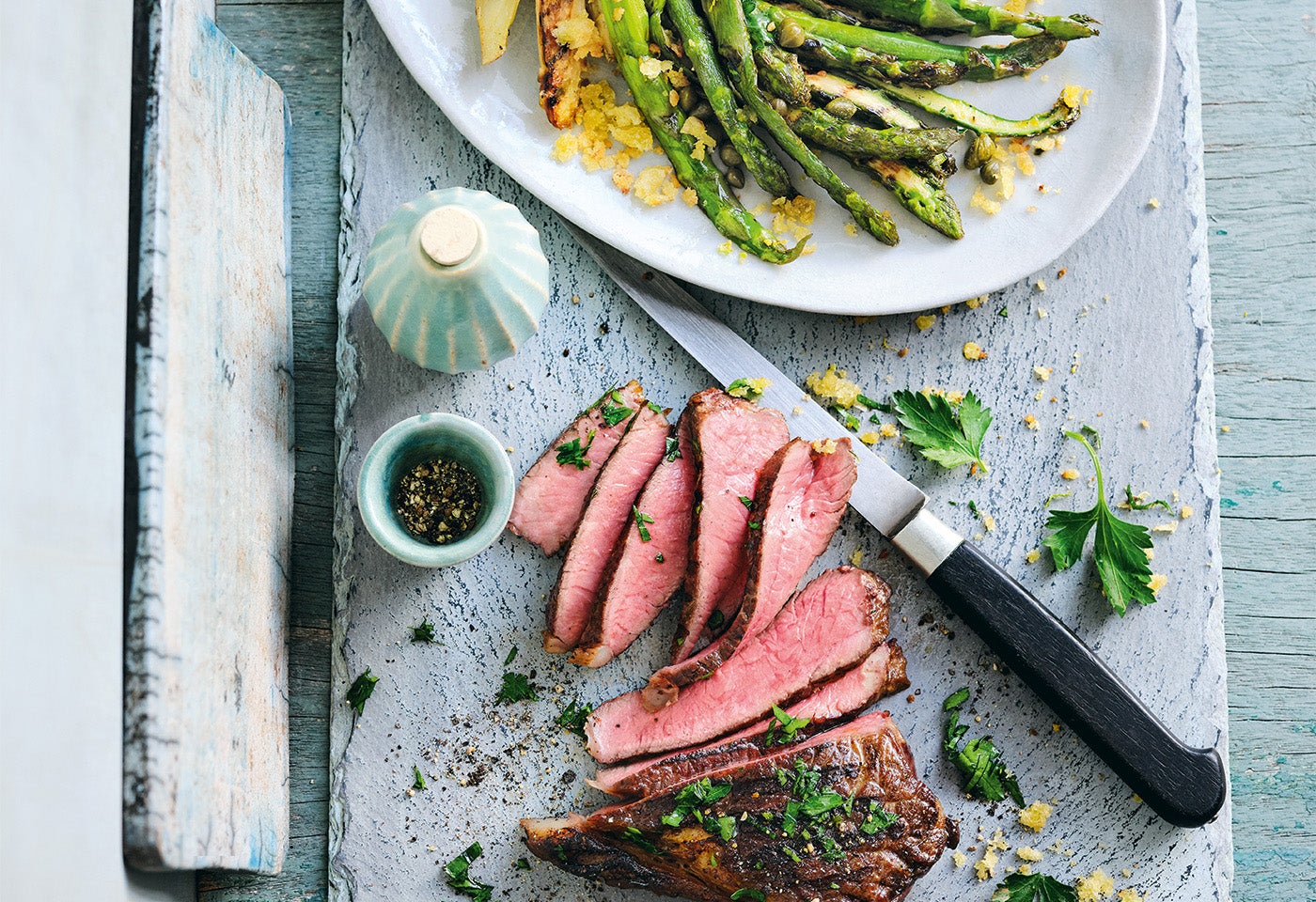 Gegrilltes Rumpsteak mit gebratenem Spargel