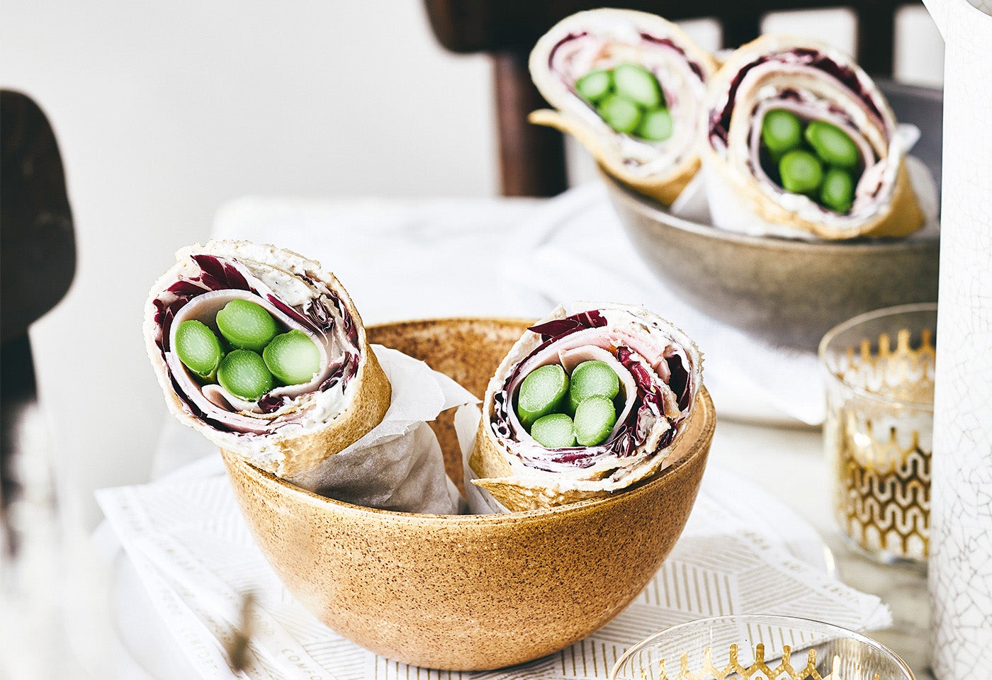 Galette-Wraps mit Beinschinken und grünem Spargel