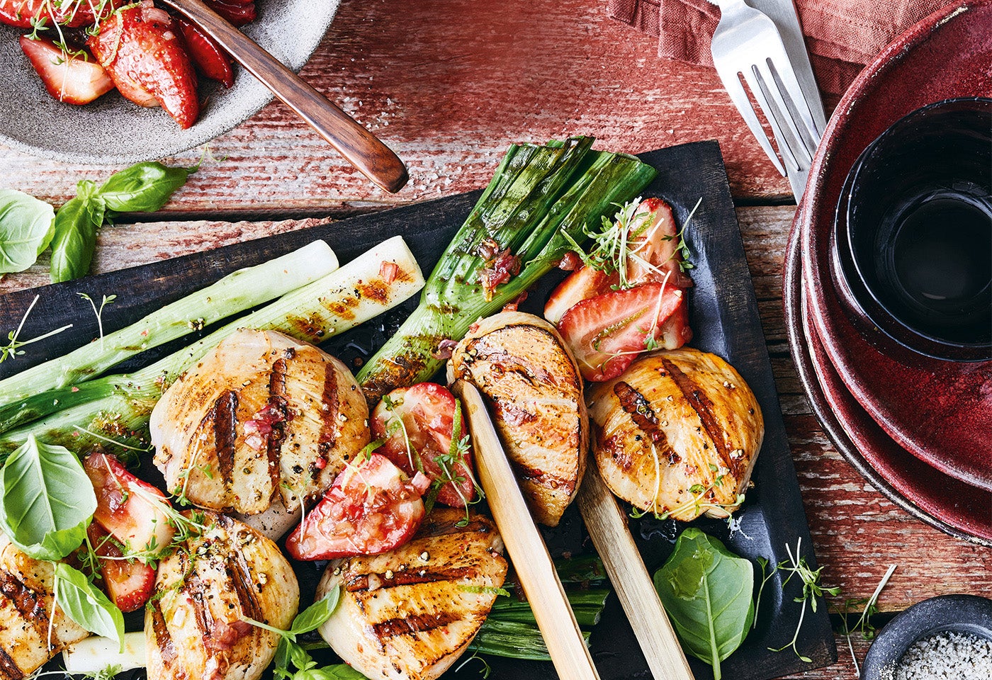 Gegrillte Putenmedaillons mit Jungzwiebeln und Erdbeeren