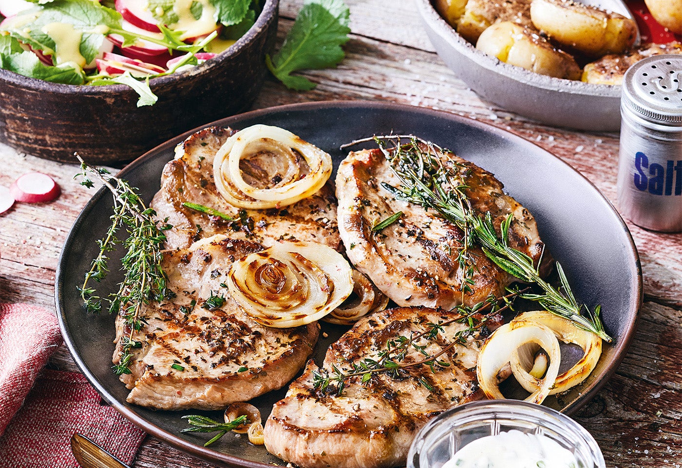 Gegrilltes Schopfsteak mit Smashed Potatoes und Radieschensalat