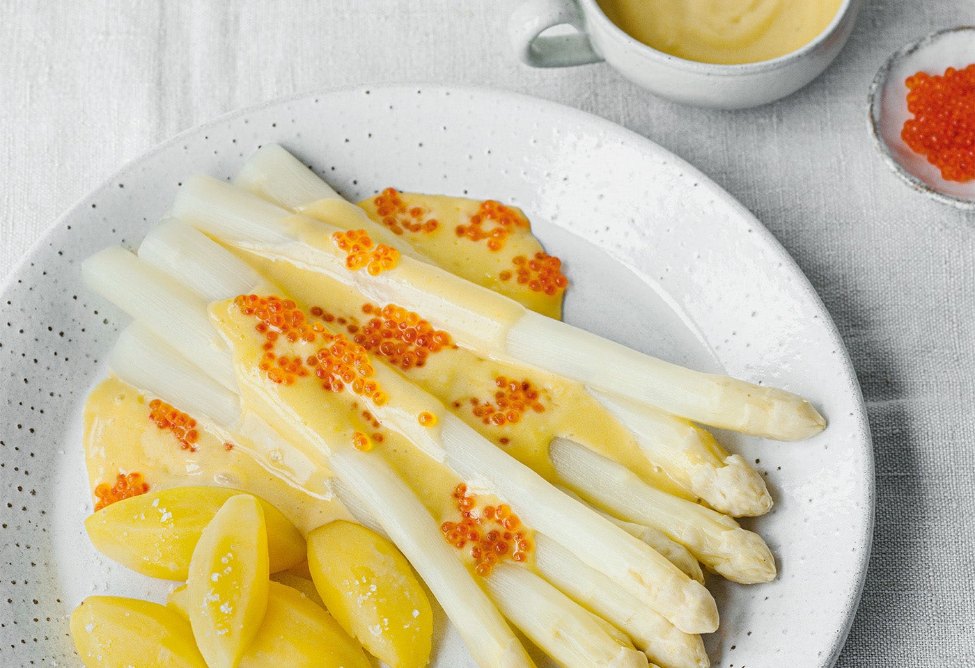 Spargel mit Nussbutter-Hollandaise und Forellenkaviar