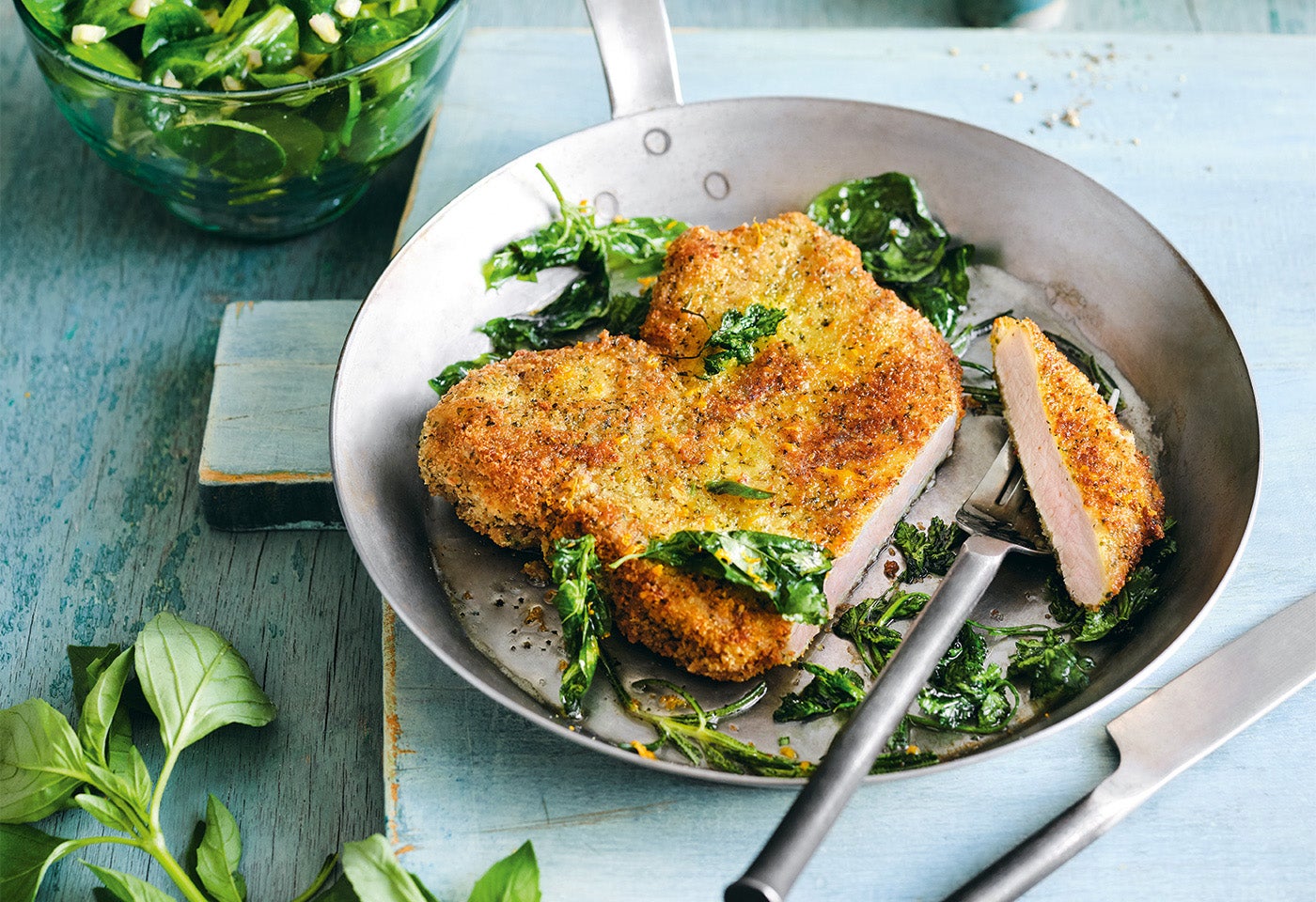Schweinskoteletts in Kräuterpanier und Vogerlsalat