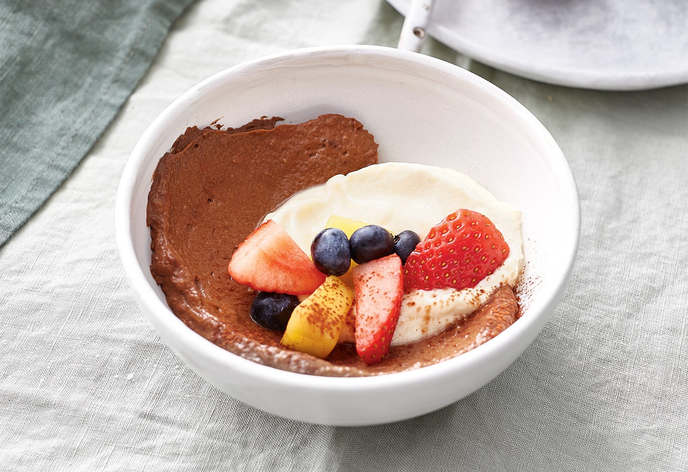 Avocado-Schokomousse mit Maracuja-Kokosjoghurt und Früchten