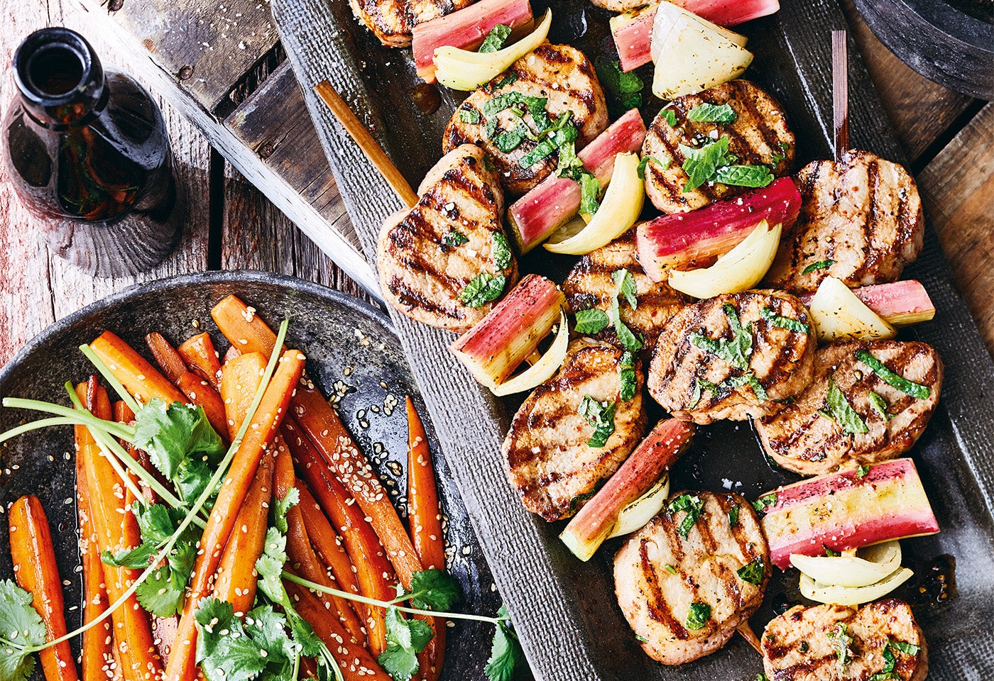 Schweinsmedaillon-Rhabarber-Spiesse mit gegrillten Karotten und Wasabicreme