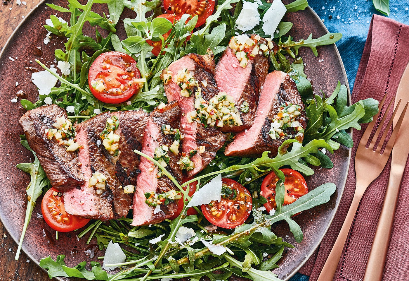 Tagliata mit Chimichurri und Tomaten-Rucola-Salat
