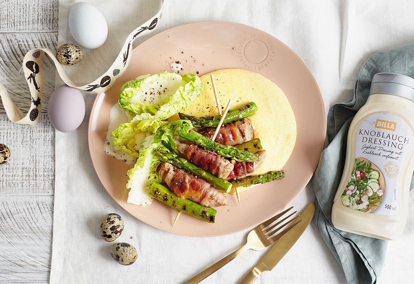 Schweinefilet-Spargel-Spieße mit Salat und Polenta