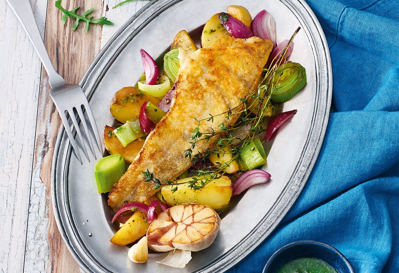 Zander alla Mugnaia mit Lauch-Erdäpfeln, Rucola und karamellisierten Äpfeln