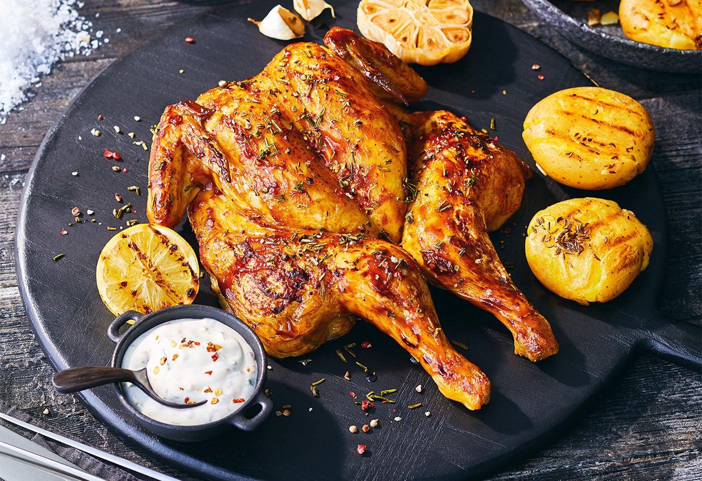 Butterfly-Grillhenderl mit Quetscherdäpfeln
