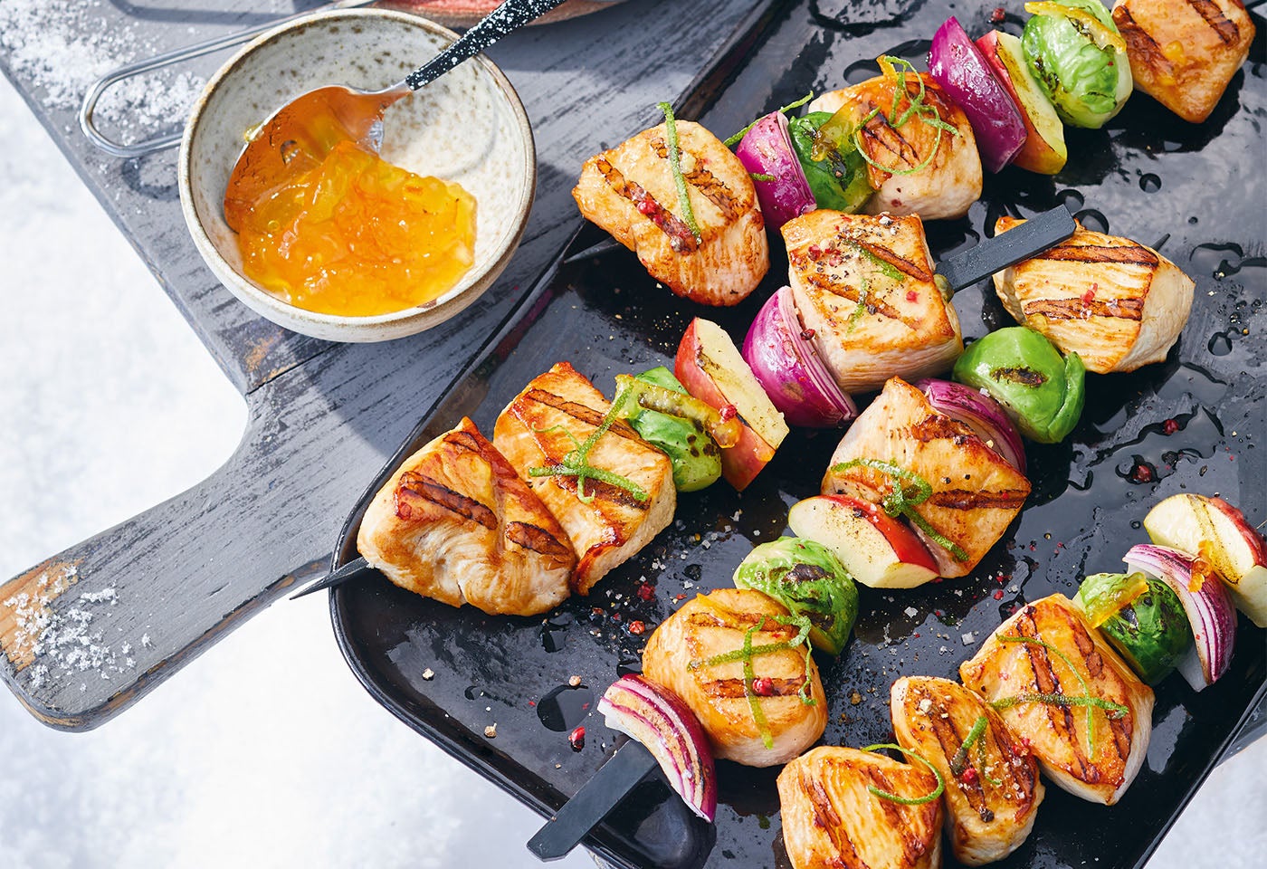 Gegrillte Putenspieße mit Apfel und Kohlsprossen
