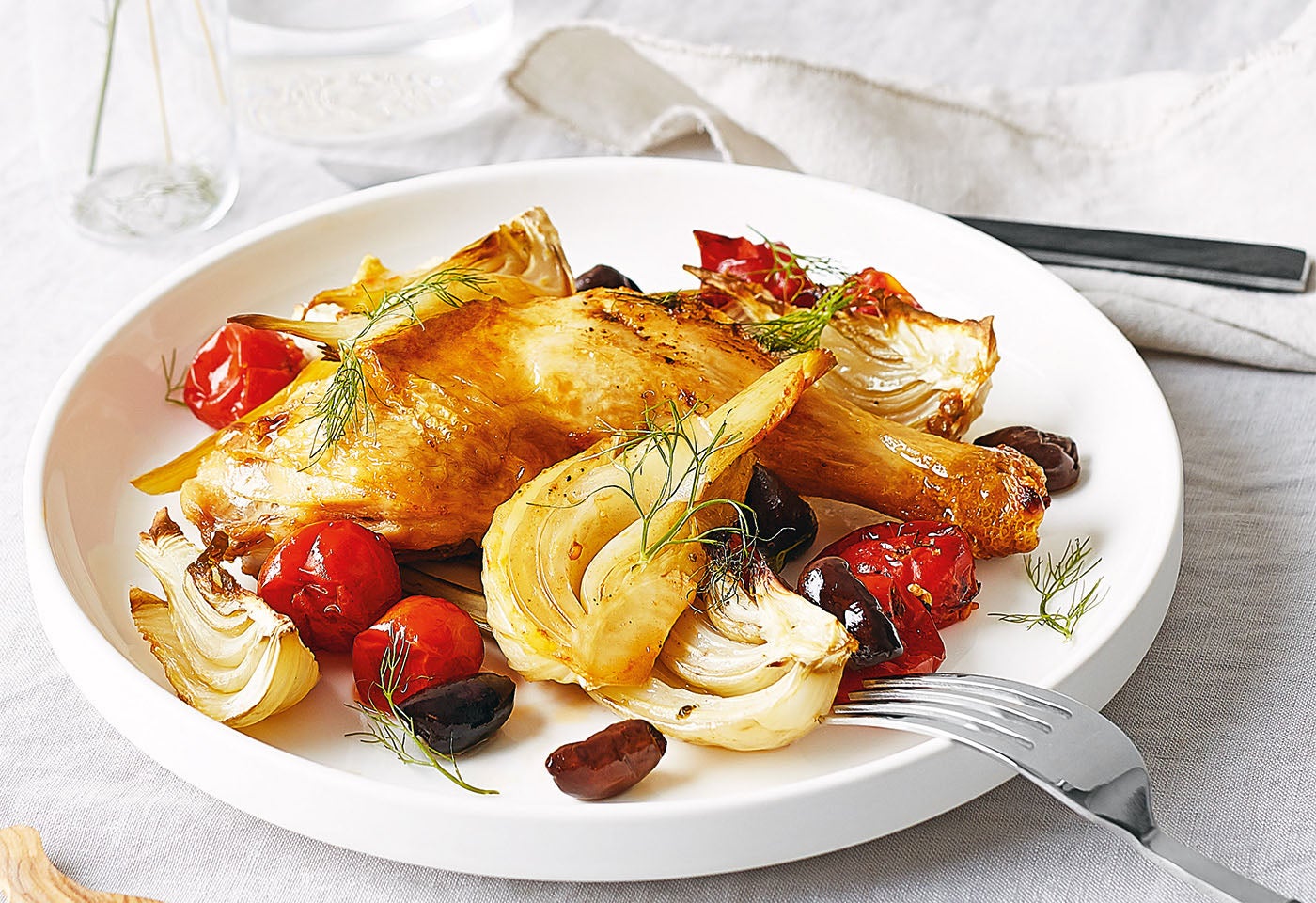 Gebratene Hühnerkeulen mit Fenchel-Oliven-Gemüse