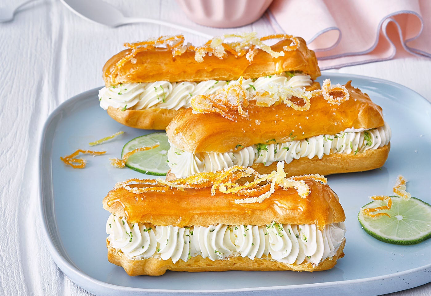 Eclairs mit Limettencreme und kandierten Zitrusfrüchte-Zesten