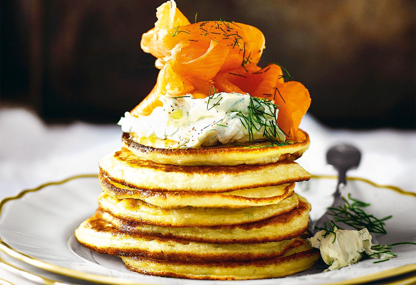 Erdäpfel-Pancakes mit Kräuter-Creme-fraiche und Räucherlachs