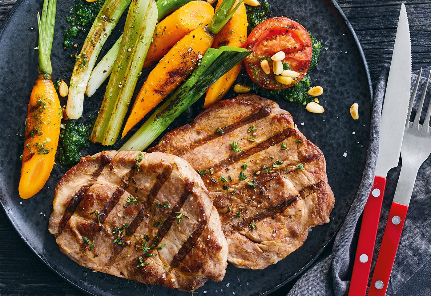 Gegrillte Schopfsteaks mit Wurzelgemüse