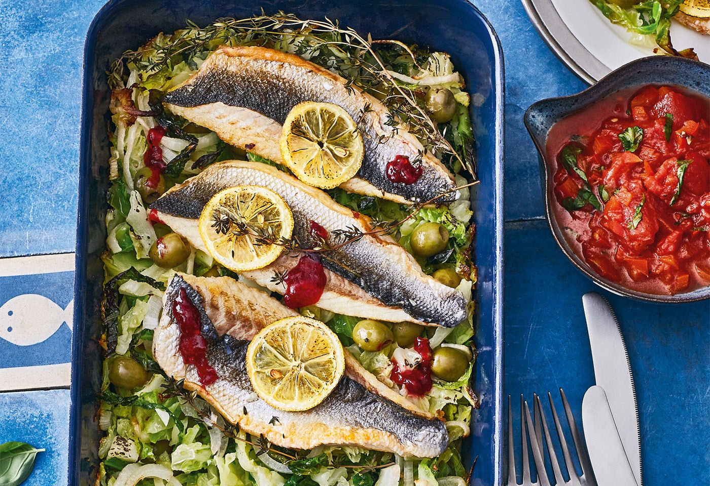 Wolfsbarschfilet aus dem Ofen auf Oliven-Kohlgemüse mit Paprikasalsa