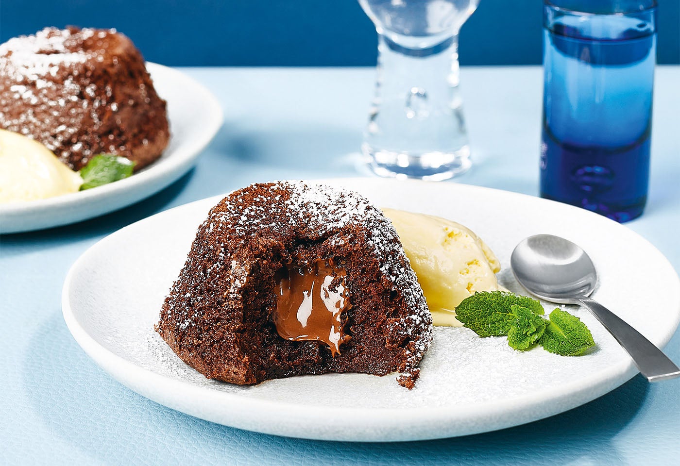 Schoko-Küchlein mit flüssigem Nougatkern und Vanilleeis
