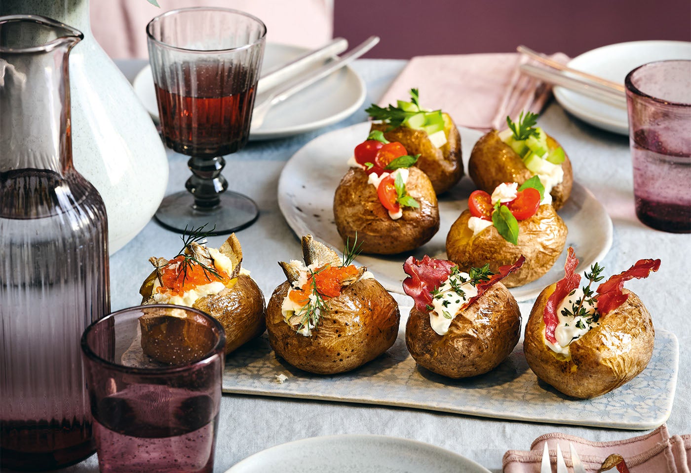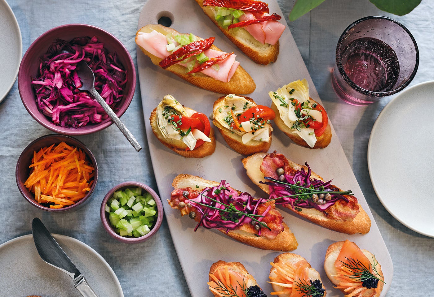 Raclette-Tartines mit Schinken-, Gemüse-, Speck- und Lachs-Belag