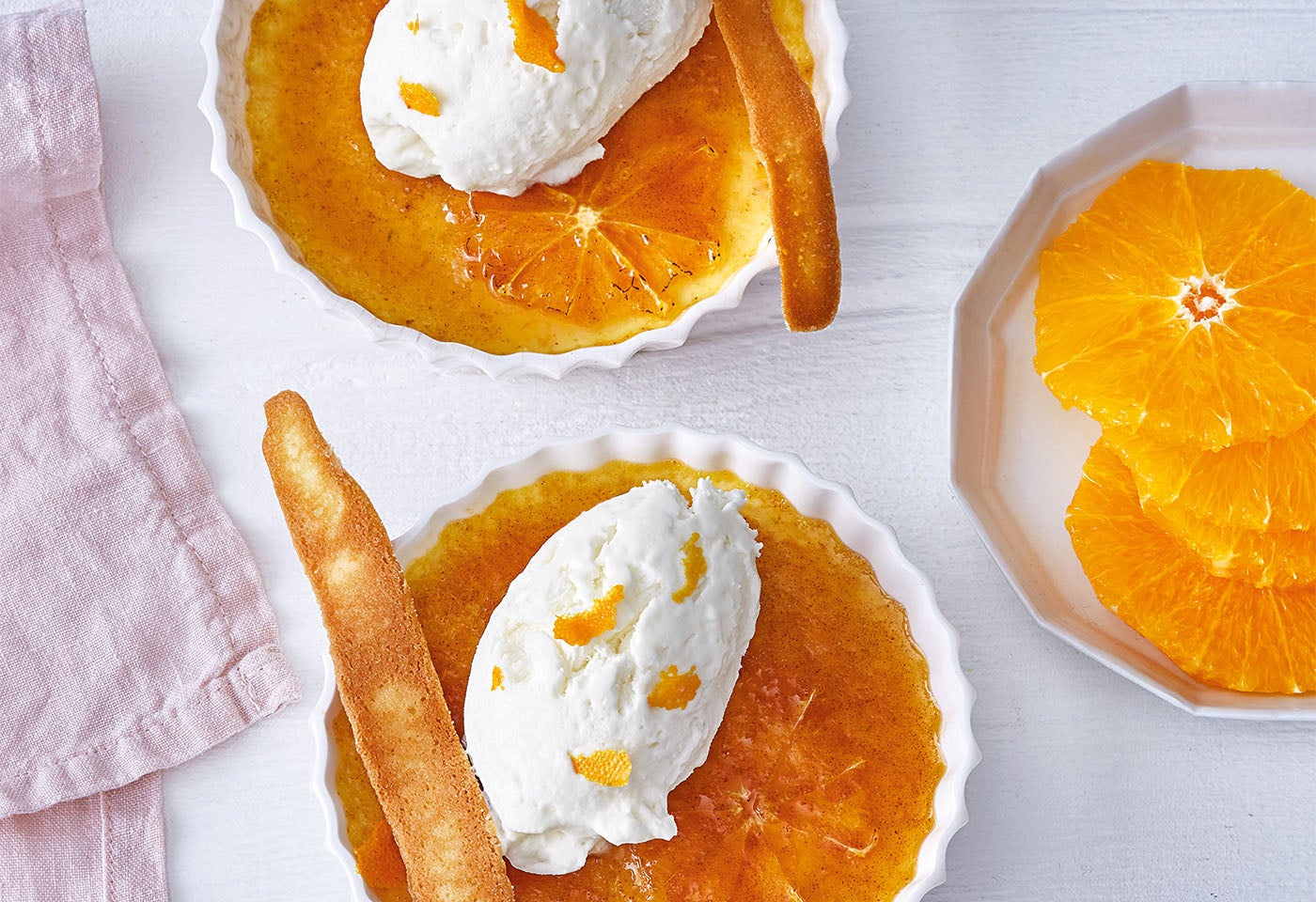 Orangen-Creme-Brulee mit Mascarponeeis und Hippen