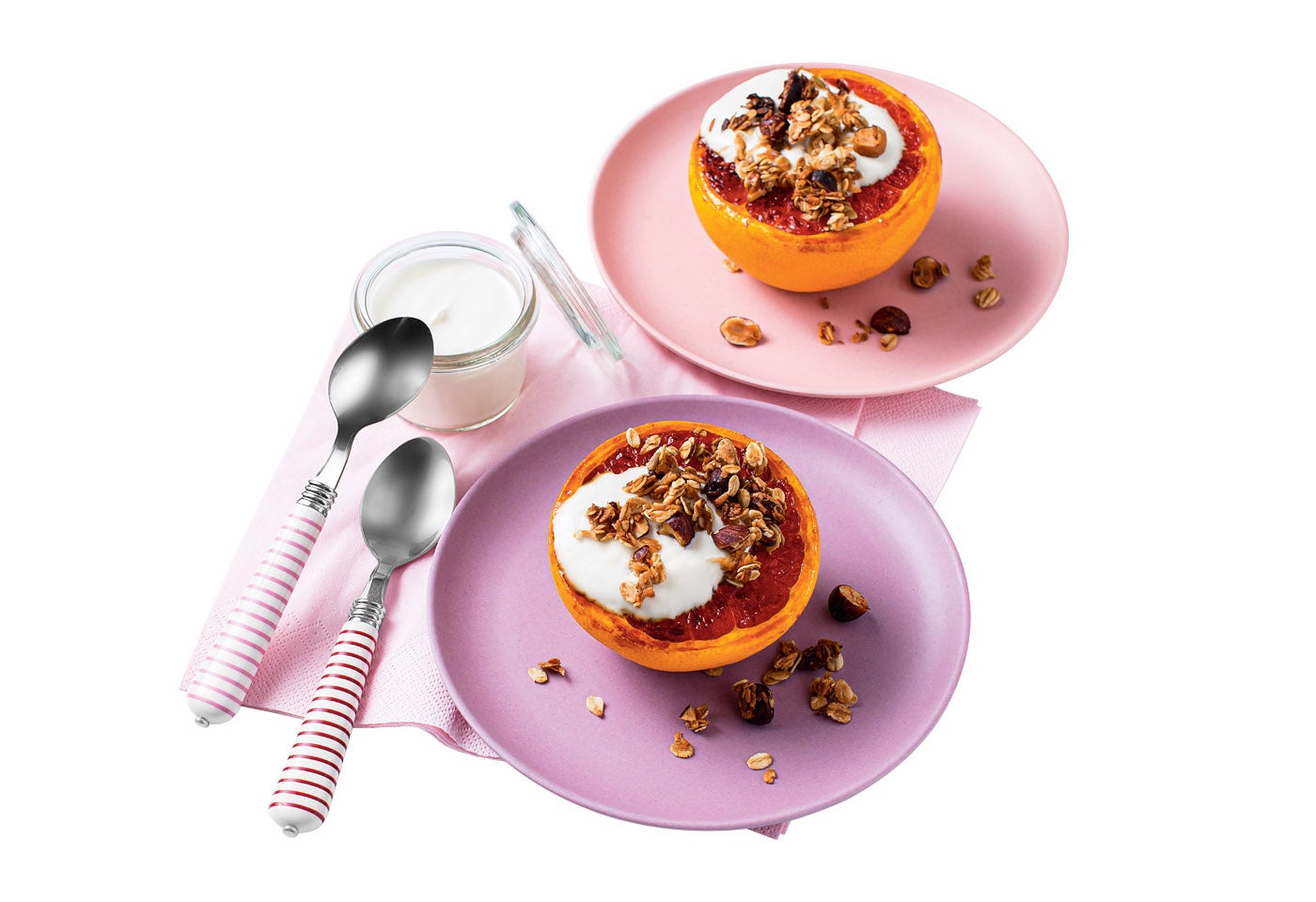 Karamellisierte Grapefruits mit schnellem Knusper-Granola