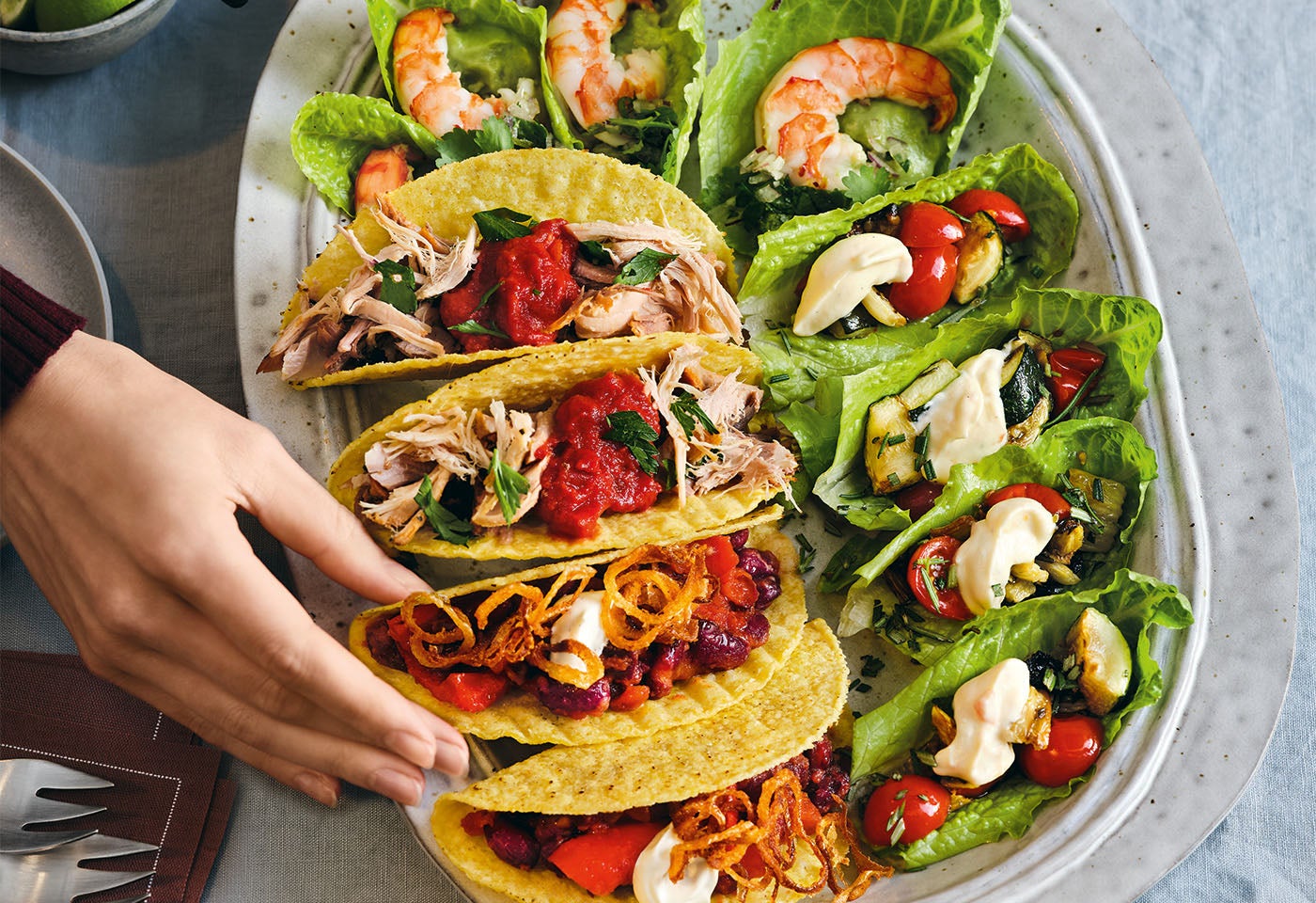 Mais- & Salat-Tacos mit Pulled Pork, Bohnenragout, Garnelen und Ofengemüse