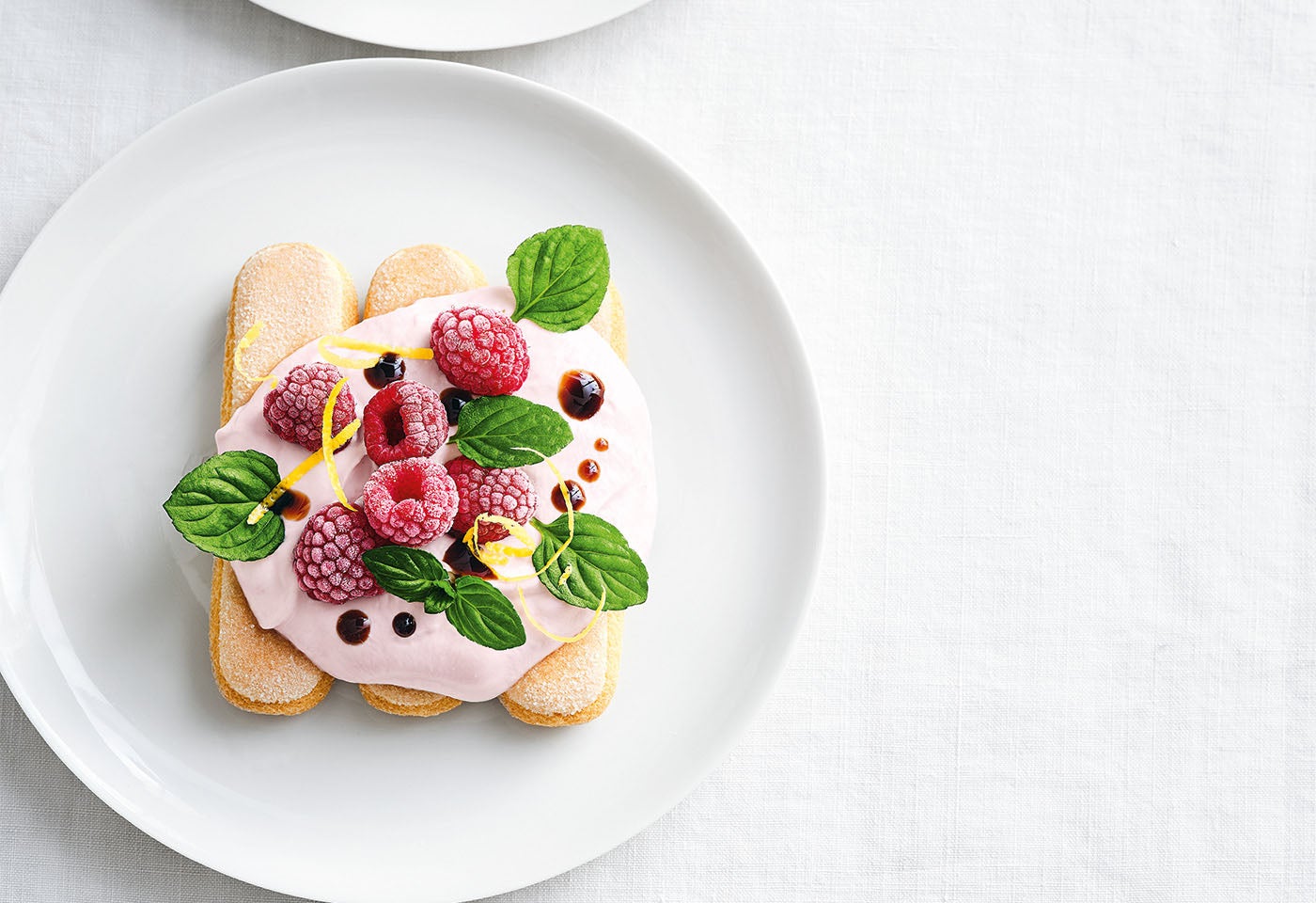 Himbeer-Topfen-Creme mit Biskotten und Balsamicoreduktion