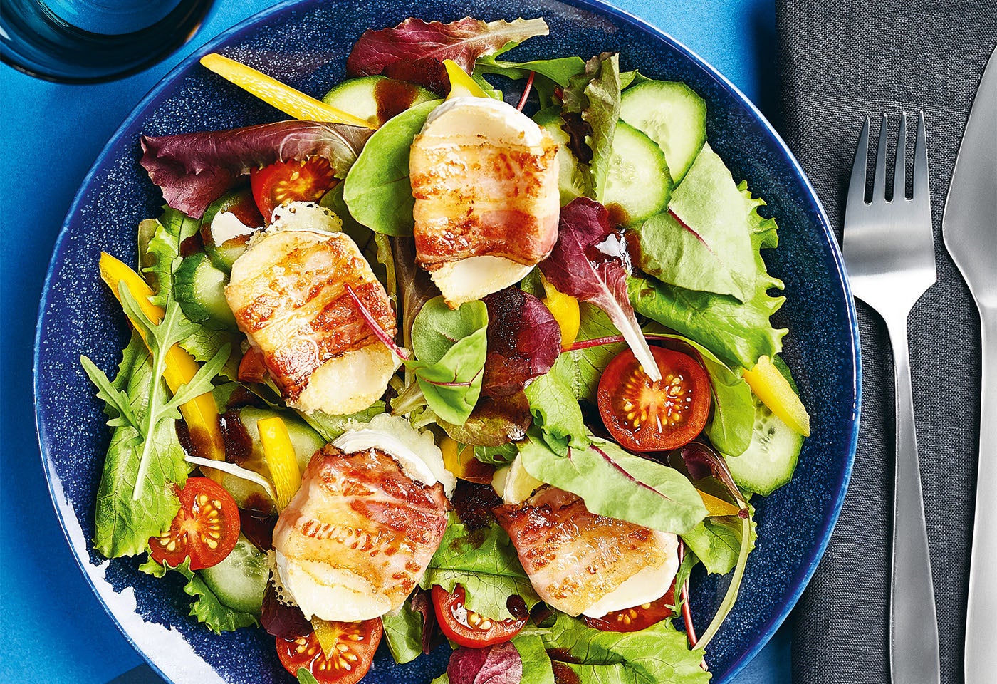 Ziegenkäse im Speckmantel auf buntem Blattsalat