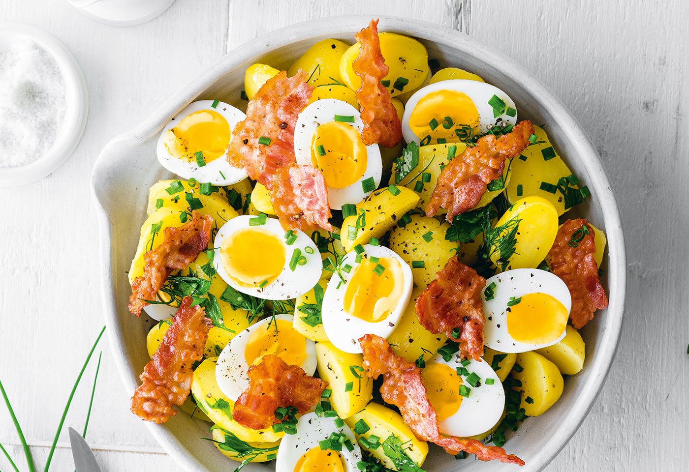 Warmer Erdäpfelsalat mit Kräutern, Eiern und Speck