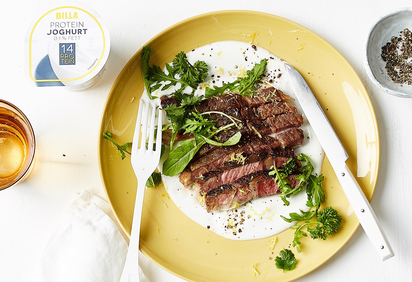 Steak auf Zitronenjoghurt mit Kräutersalat