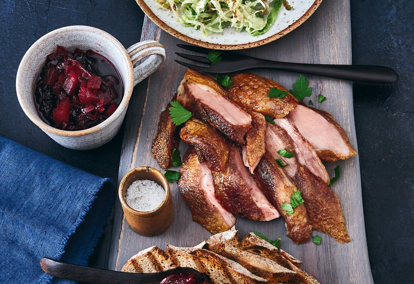 Gänseconfit mit Apfel-Zwiebel-Relish und gebratenem Kohl