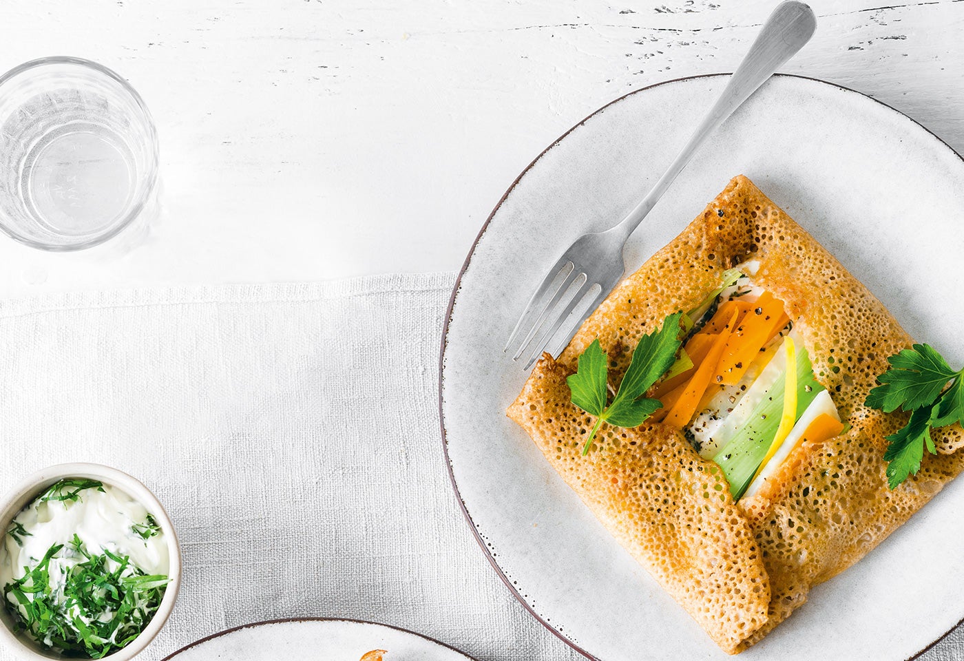 Buchweizengalettes mit Kräuterrahm und Wurzelgemüse