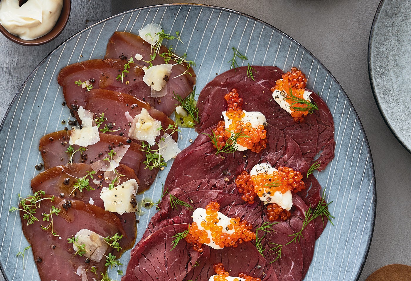 Carpaccio "Surf and Turf" mit Forellenkaviar und Trüffelmayonnaise