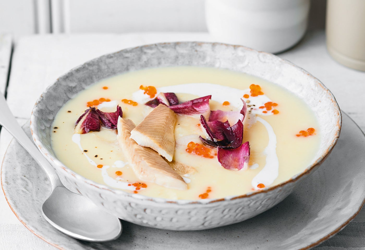 Erdäpfel-Apfel-Suppe mit Räucherforelle und Chicorée
