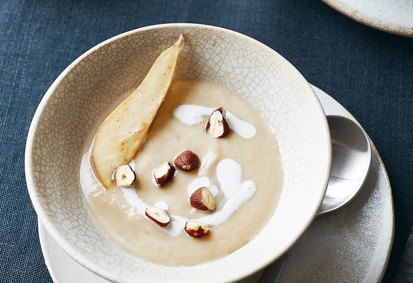 Maronisuppe mit gebratener Birne und Haselnüssen