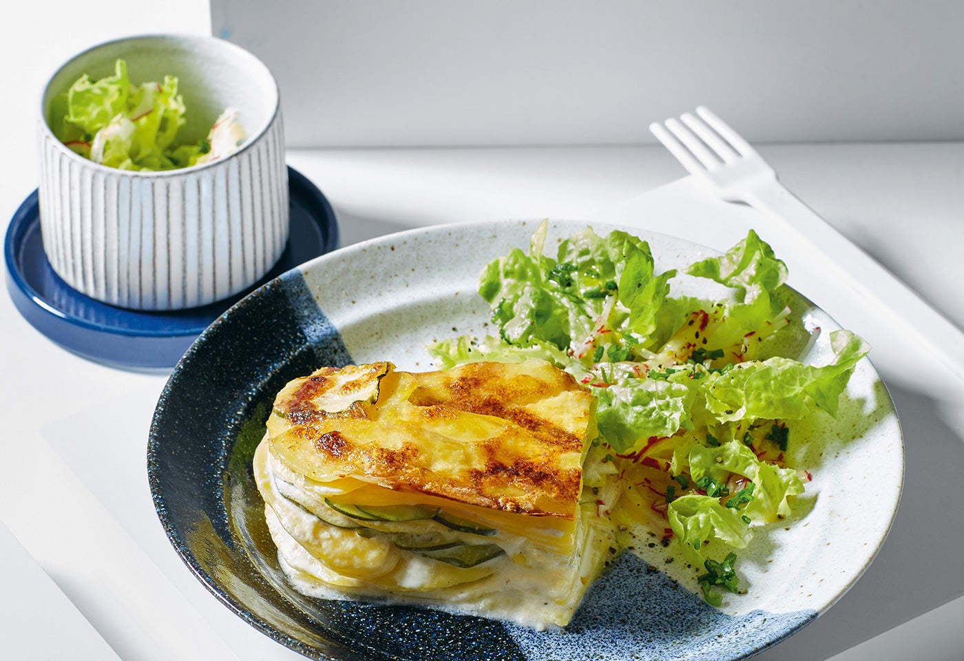 Zucchini-Erdäpfel-Gratin mit Radieschen-Blattsalat
