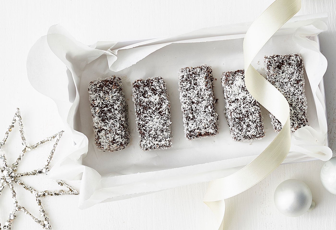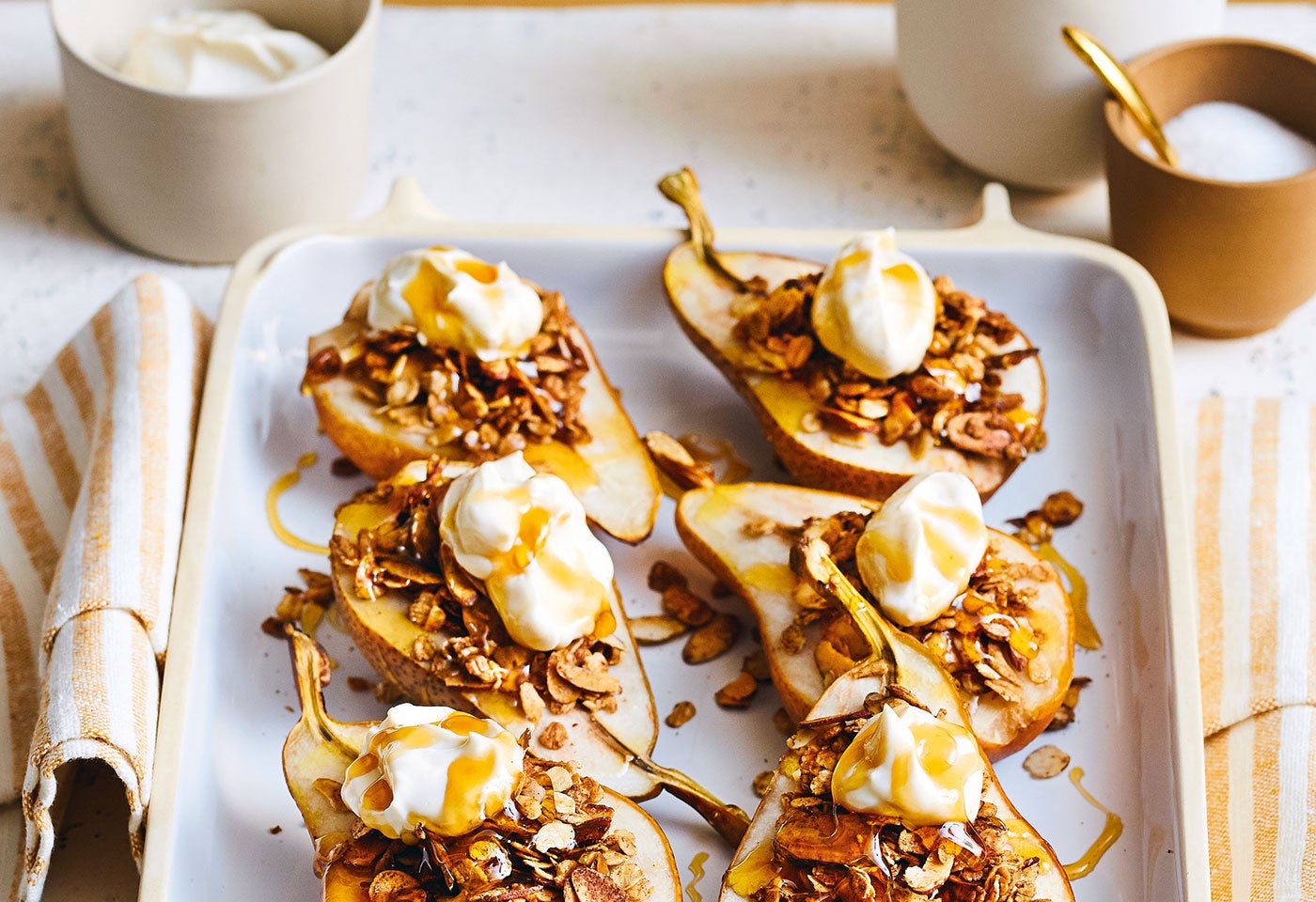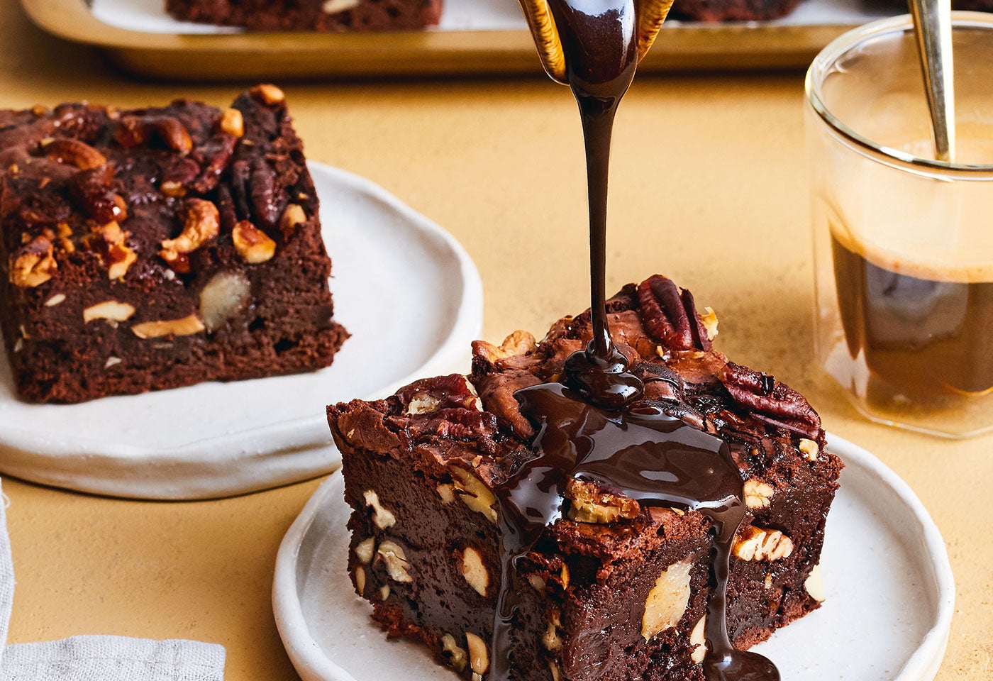 Birnen-Nuss-Brownies mit Honig-Schokosauce