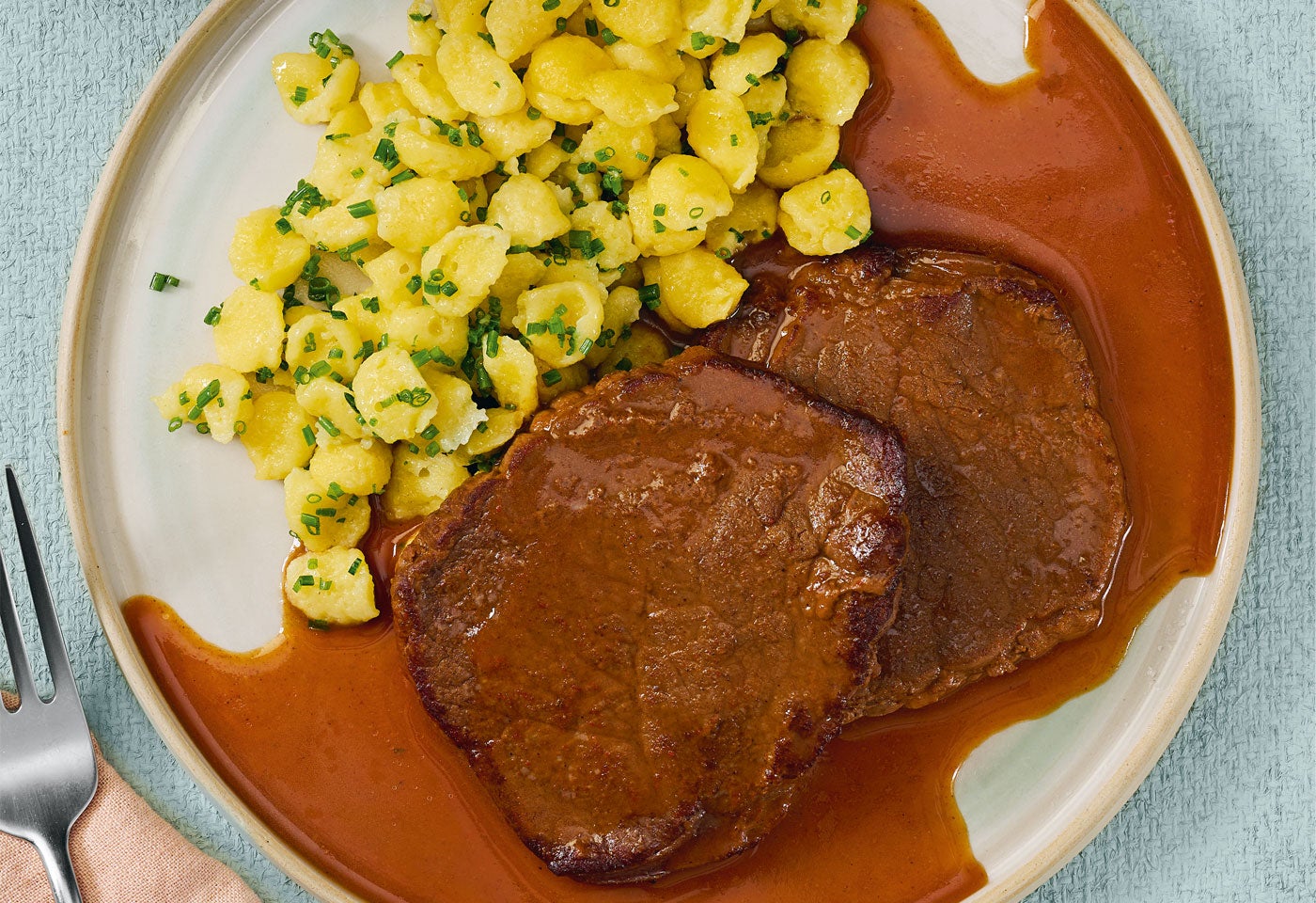 Sous-Vide-Rindsschnitzel mit Schnittlauchnockerln