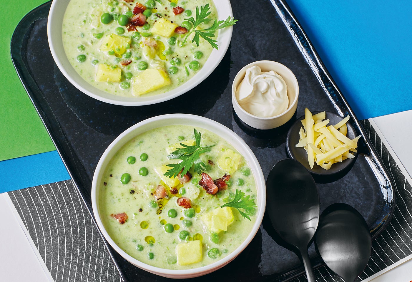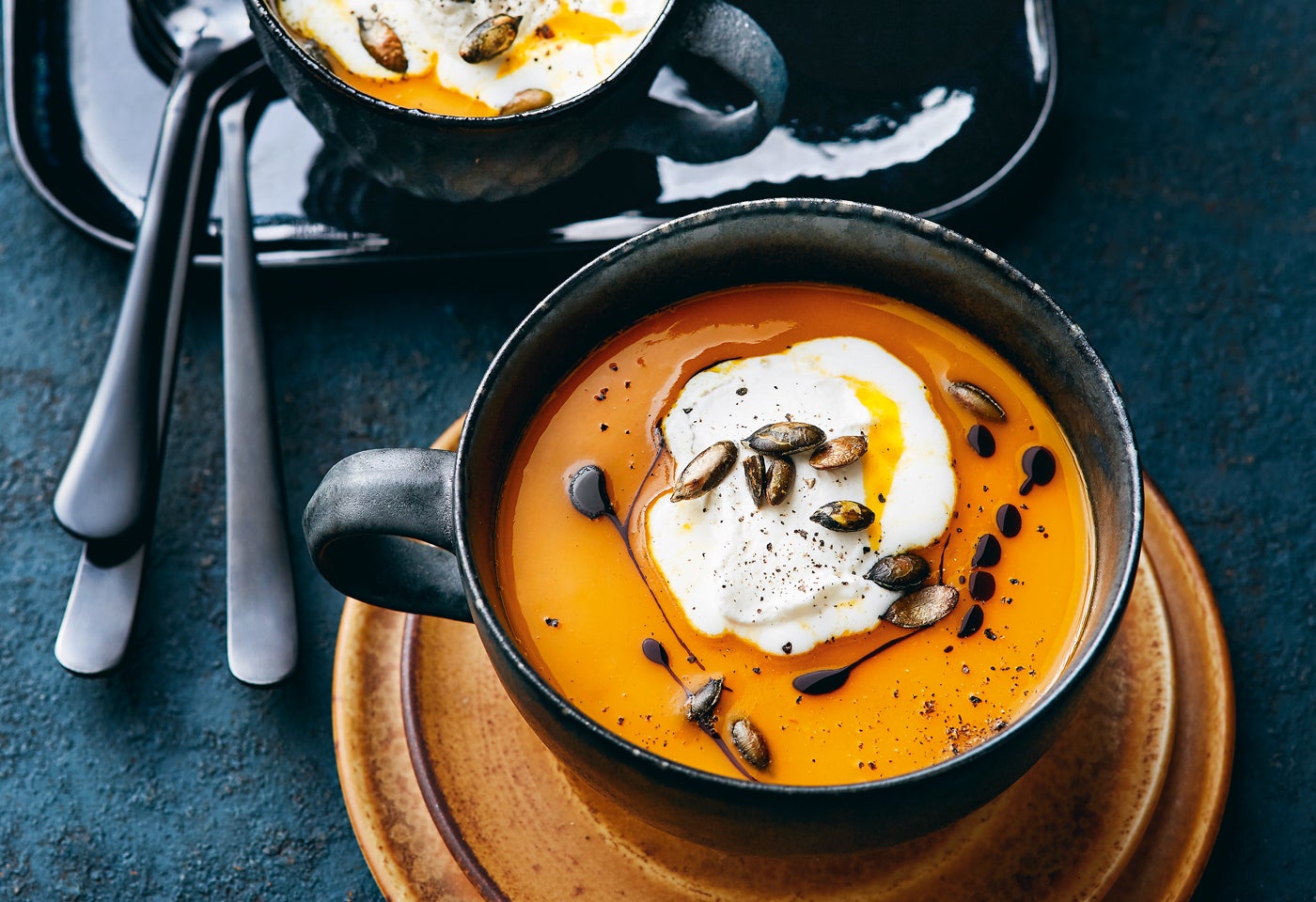 Kürbis-Apfel-Suppe mit Crème-fraîche-Häubchen und Kürbiskernen