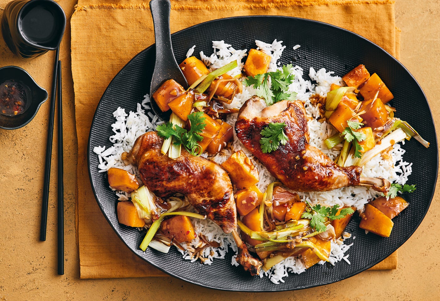Hühnerkeulen und asiatischer Kürbis mit Reis