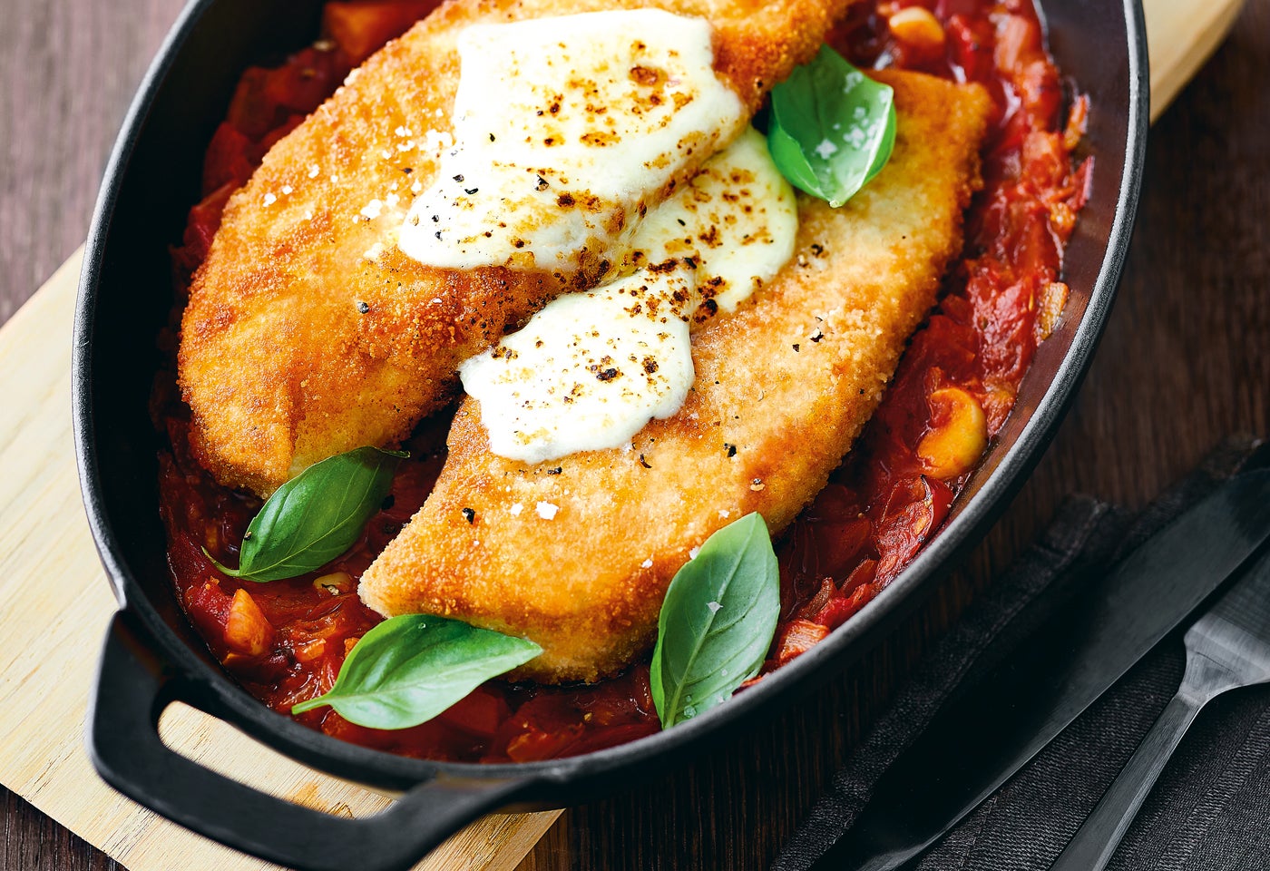 Hühnerschnitzel "Parma" mit Mozzarella überbacken auf Tomatensauce