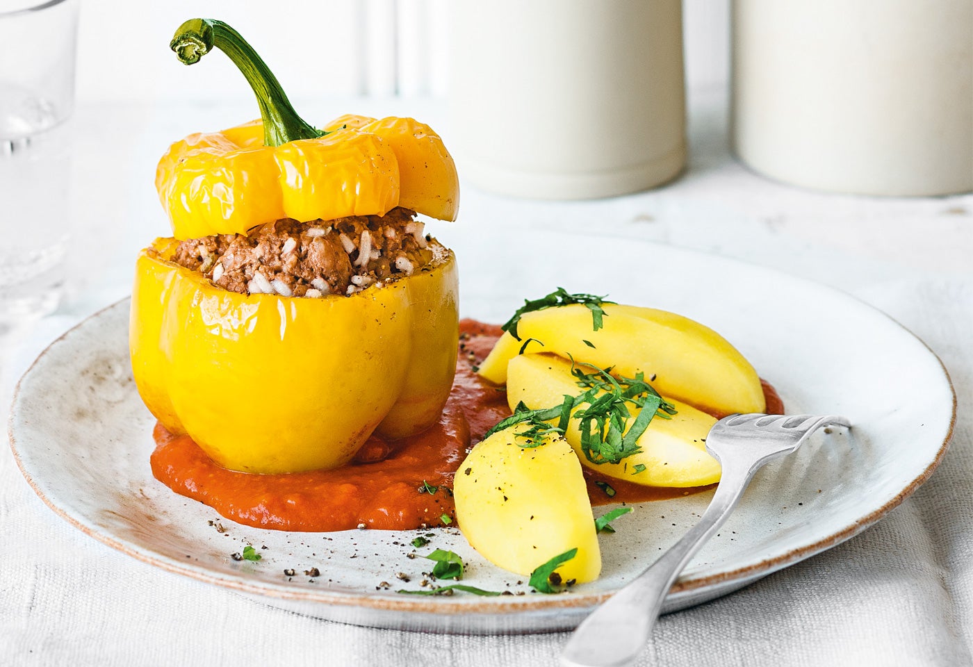 Gefüllte Paprika mit Tomatensauce und Salzerdäpfeln