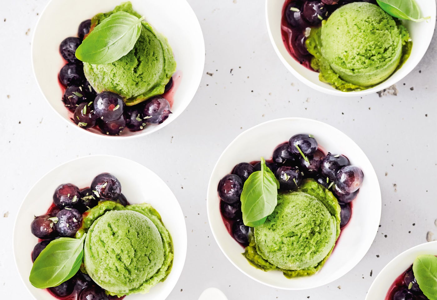 Basilikumsorbet mit Rosmarin-Heidelbeeren