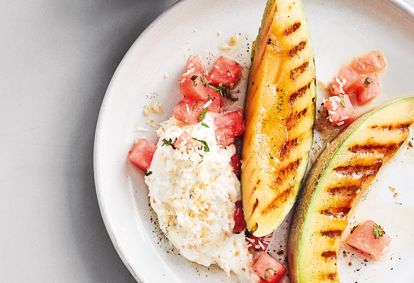 Karamellisierte Zuckermelone mit Kokosjoghurt und Wassermelone