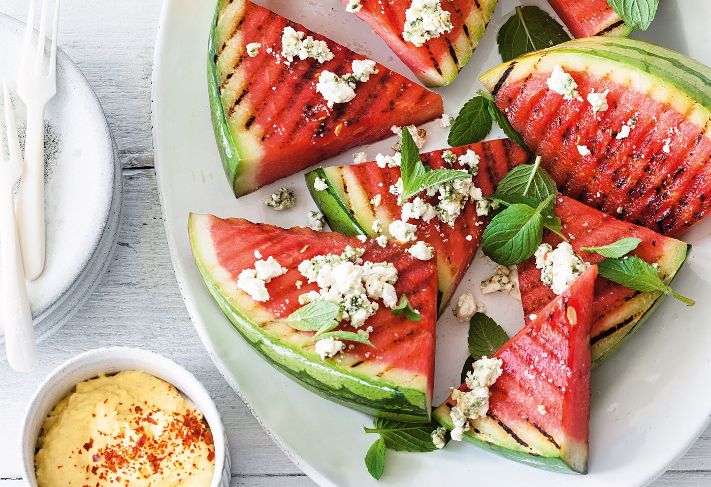 Gegrillte Wassermelonen-Wedges mit Feta-Minz-Crumble und Maisdip