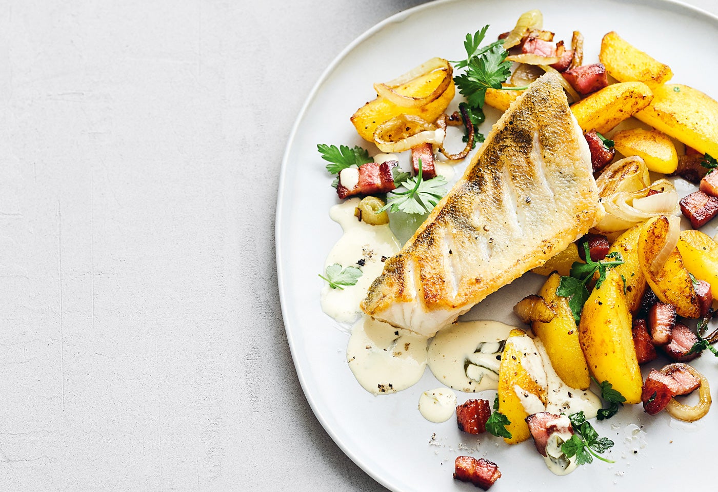 Zanderfilet mit Senfsauce und Speck-Braterdäpfeln