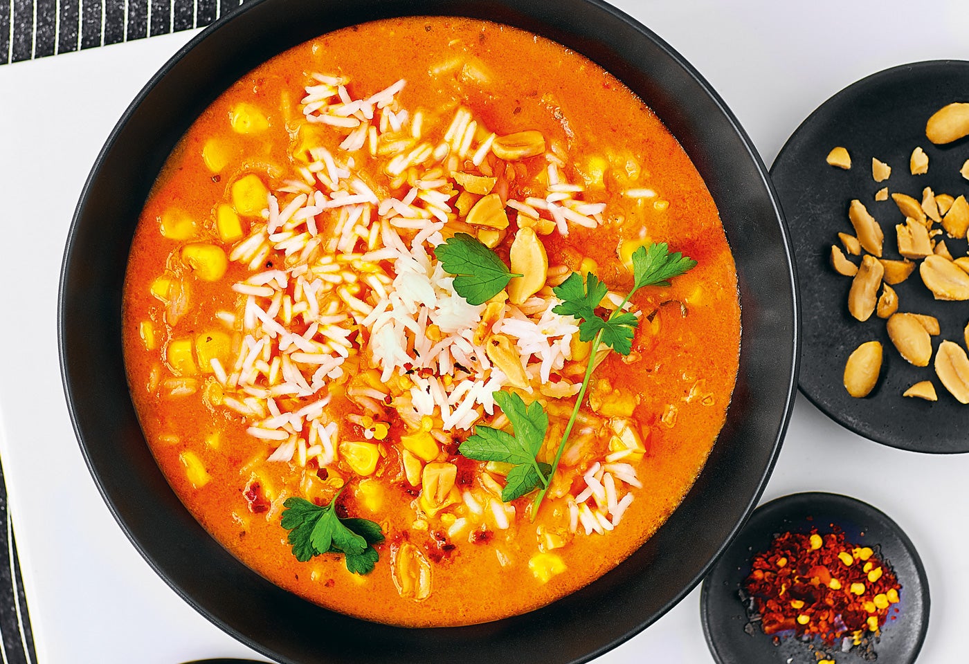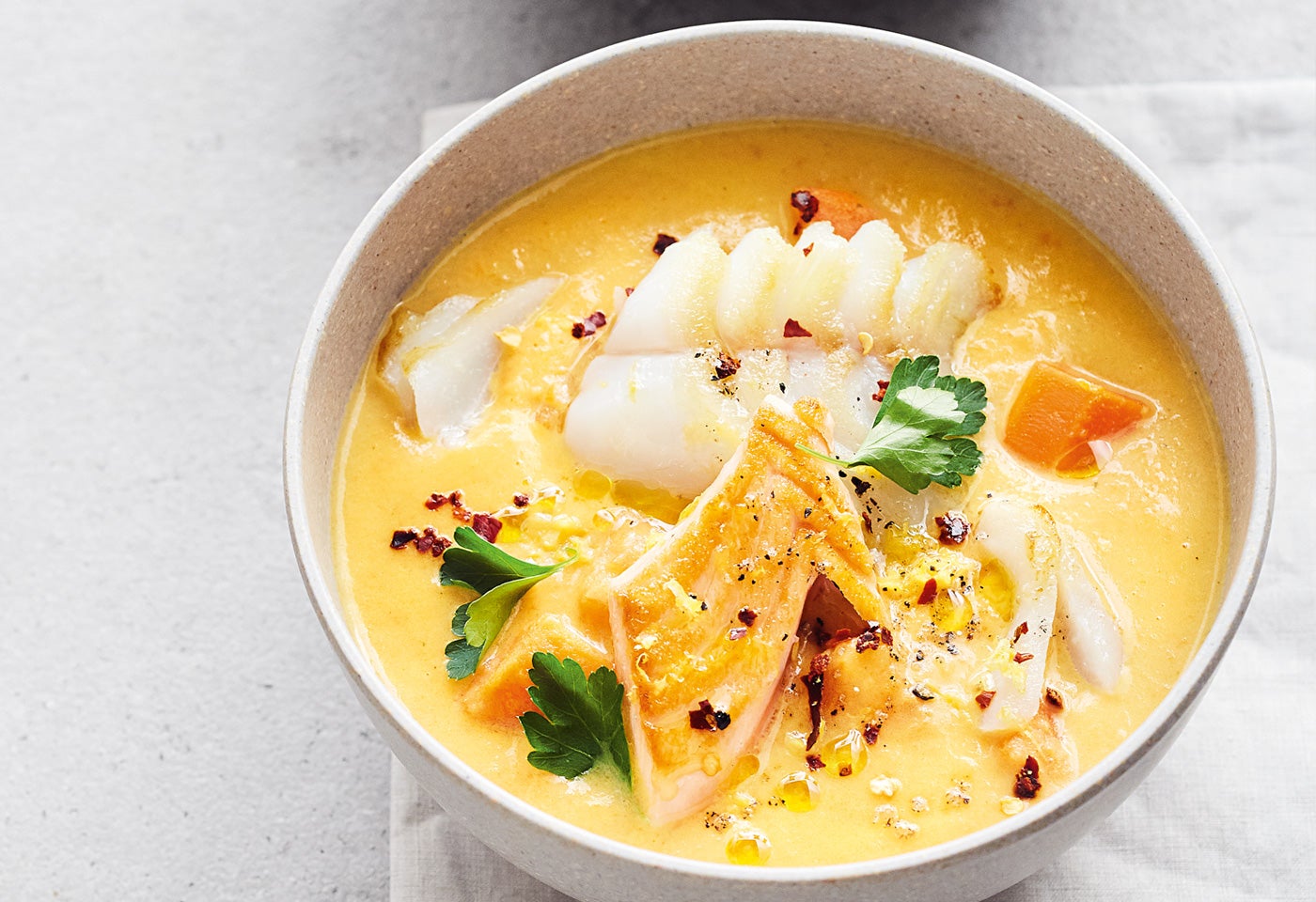 Karotten-Kokos-Suppe mit gebratenem Dorsch und Lachs