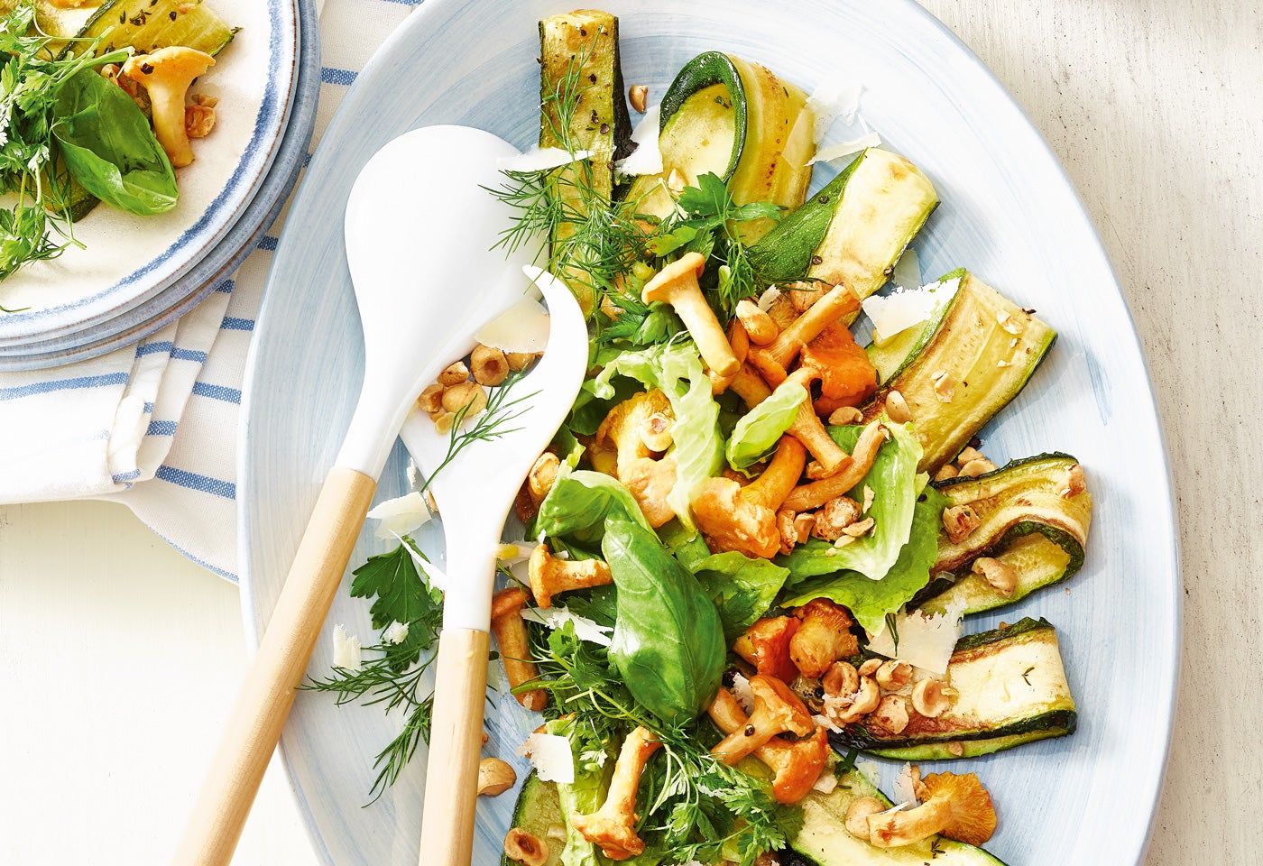 Salat mit gebratenen Zucchini, Eierschwammerln und Haselnüssen