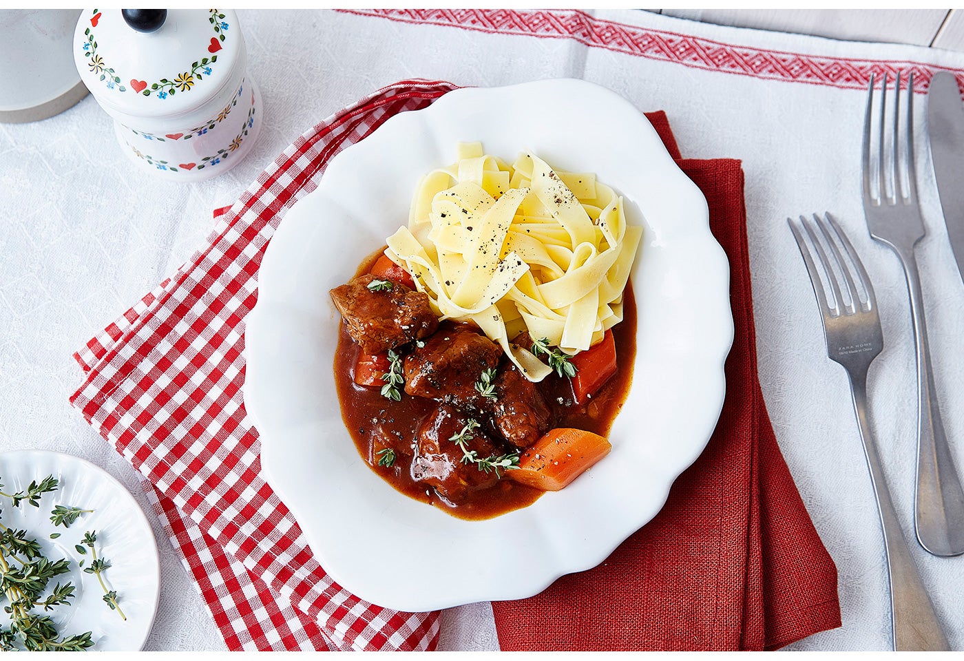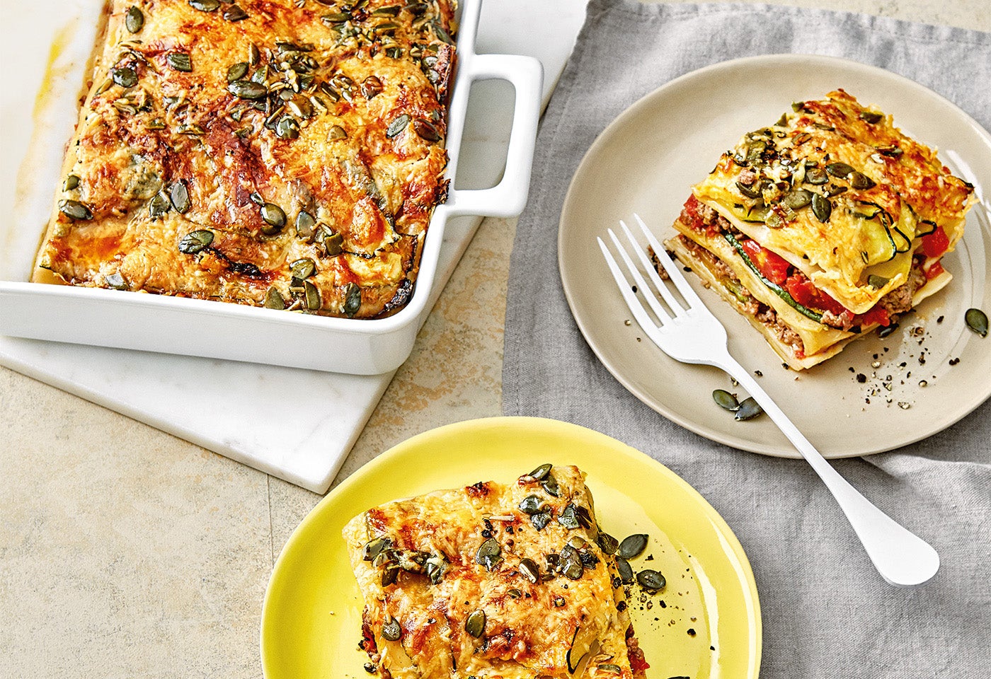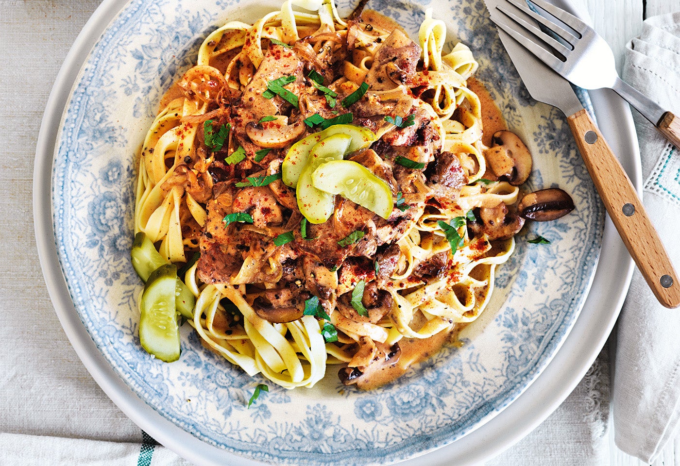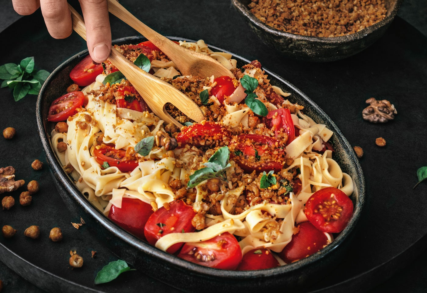 Selbstgemachte Tagliatelle mit Tomaten und Kichererbsen-Crumble