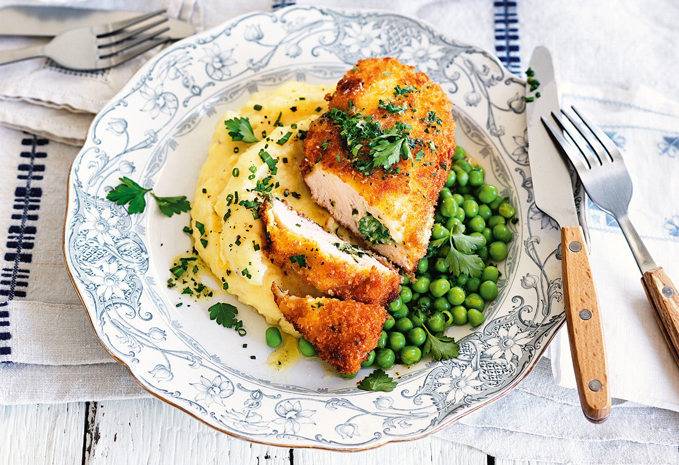 Kiewer Kotelett mit Erbsen und Erdäpfelpüree